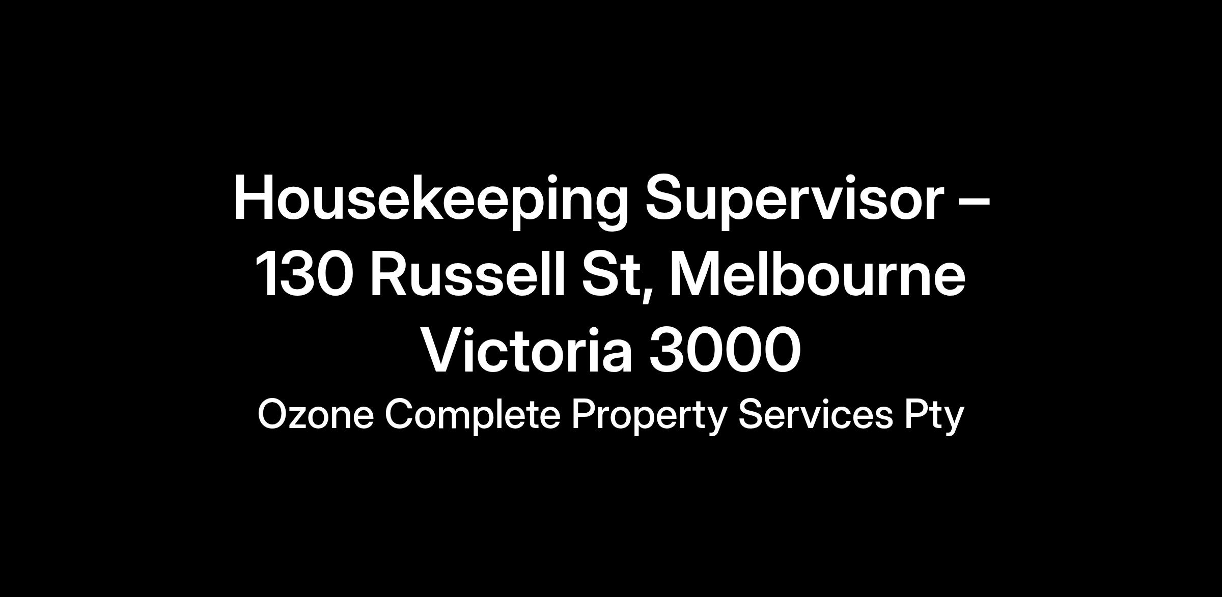 We are seeking a dedicated Housekeeping Supervisor to join our team at 130 Russell St, Melbourne, Victoria. This part-time contract role is essential in ensuring the highest standards of cleanliness and organisation within our establishment, contributing to an exceptional guest experience in the travel and tourism industry. The ideal candidate will possess strong leadership skills and a keen eye for detail, ensuring that our housekeeping team operates efficiently and effectively.